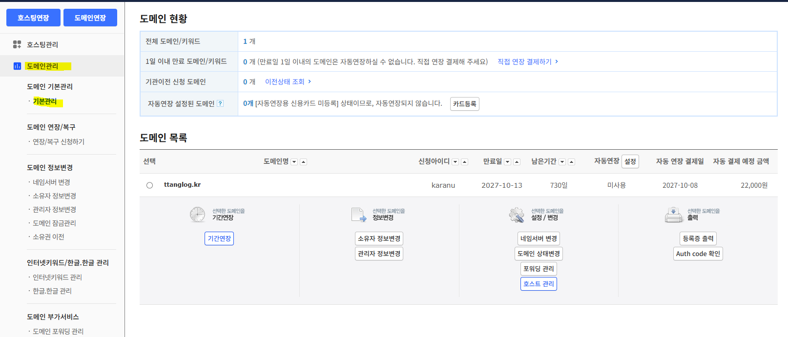 도메인관리 - 기본관리에서 도메인현황을 확인할 수 있다.