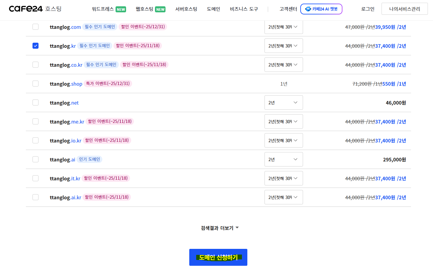 여기서 마음에 는 걸로 선택 후 도메인 신청하기를 클릭한다.