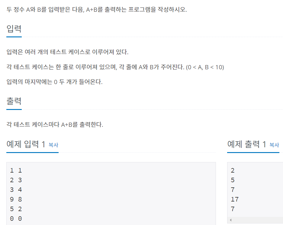 백준 10952번 A + B - 5 while문 1단계