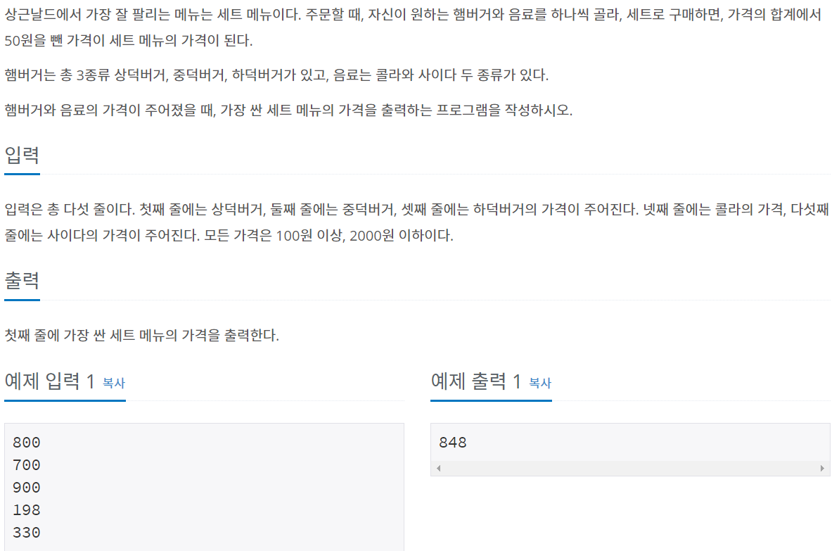 이 문제는 햄버거3종류 중 가격 가장 싼 것, 음료수 2개 중 가장 싼 것 하나를 조합해 50원 할인 후 가장 싼 세트 가격을 출력하는 것이다.