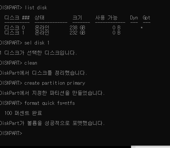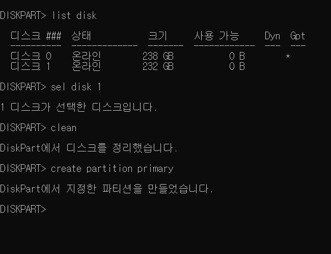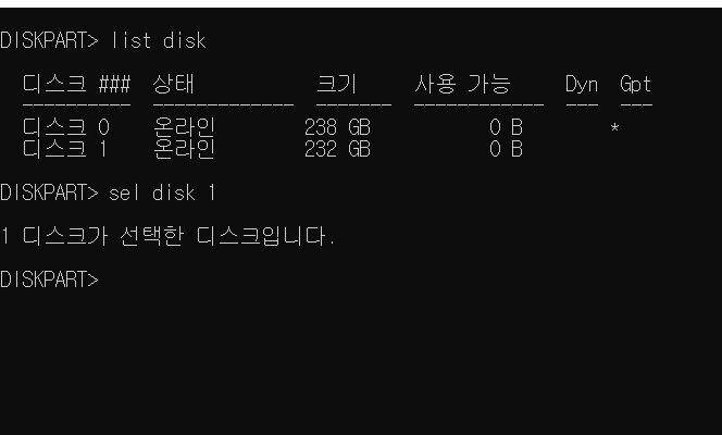 sel 은 select에 약자로 select disk 1 이렇게 풀로 입력해도 되었던 걸로 기억하는데 뭐 sel로만 해도 되니까..