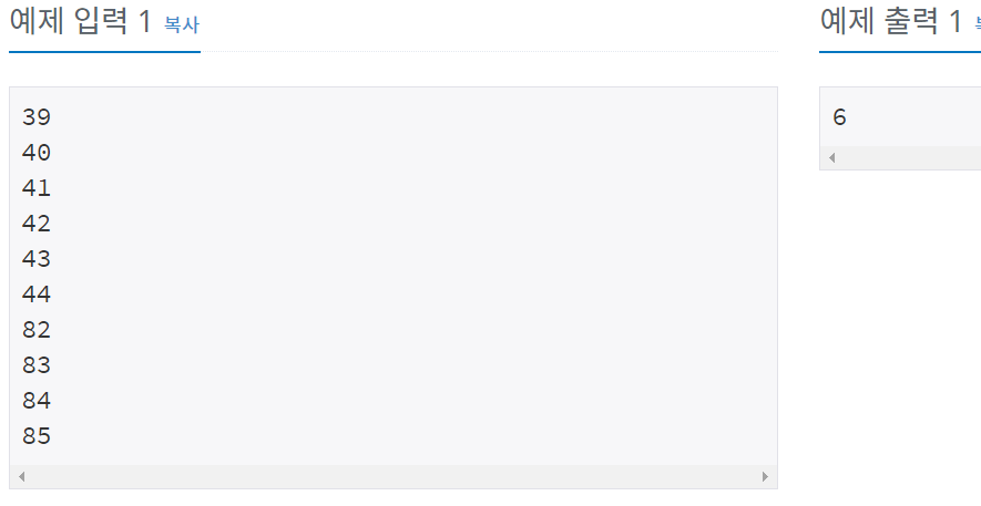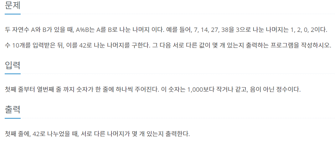뭐 대충 일단 수를 10개 입력받는다. 그리고 42이로 나눠서 서로 다른 수가 몇 개인지 출력하라 인데 위에 예제처럼 수를 입력하면 나머지가 39, 40, 41, 0, 1, 2, 40, 41, 0, 1 이렇게 나온다. 중복되는 수를 제거하면 39, 40, 41, 0, 1, 2 이렇게 6개만 남는다. 그럼 6을 출력하는 것이다.