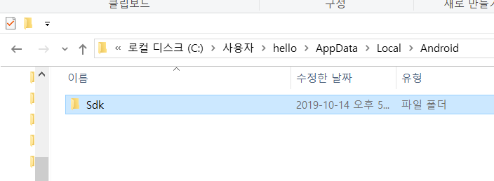 마지막으로 Appdata - Local -Android 경로로 가면 Sdk폴더가 있다.