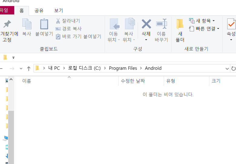 먼저 안드로이드가 깔려있는 경로로 와본다. c밑에 program files 밑에 android 폴더가 있다.