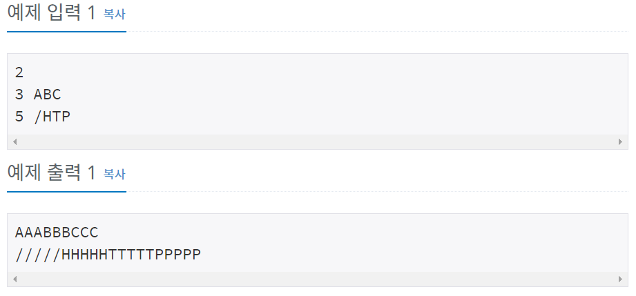 예제에서 봤을 때 3 ABC는 AAABBBCCC이렇게 출력한다. 각 입력 문자를 반복할 수만큼 출력하는 것이다.
