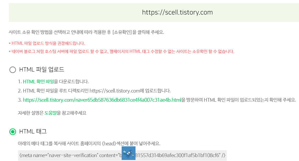 소유권 확인을 위한 작업을 한다. 뭐 둘 중 아무거나 해도 되지만 그래도 다운로드하고~ 업로드하고~ 하는 것 보단 html태그를 복사해서 head에 붙여 넣는게 더 편하다. html태그를 복사해서 티스토리 스킨편집에 가서 붙여 넣으면 된다.