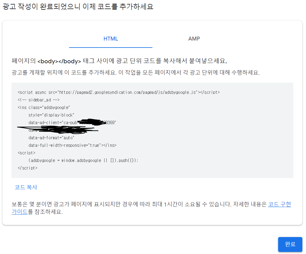 완료를 누르면 된다. 바로 사용할 거면 코드 복사를 하자.