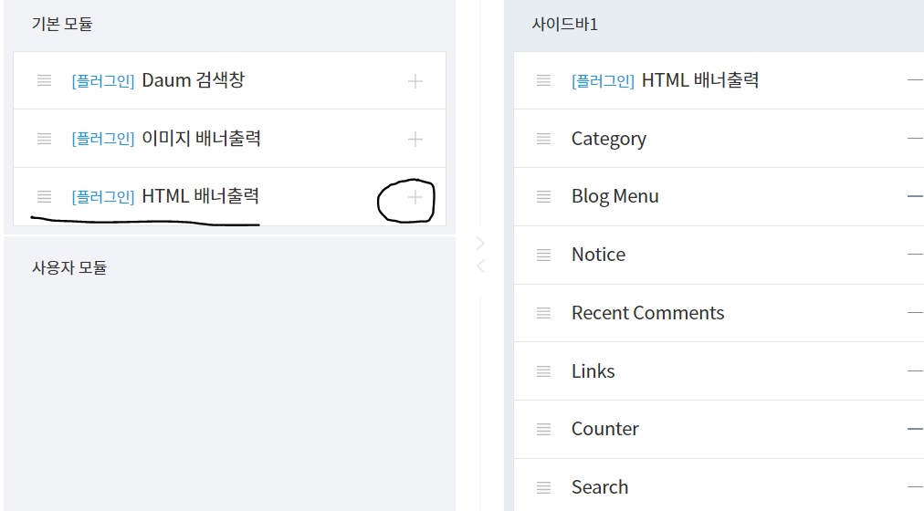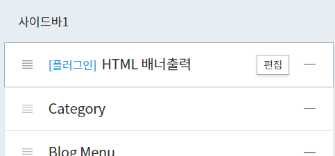 HTML 배너출력 에 + 버튼을 누른다. 그러면 우측에 사이드바1에 추가되어있는것을 볼 수 있다.