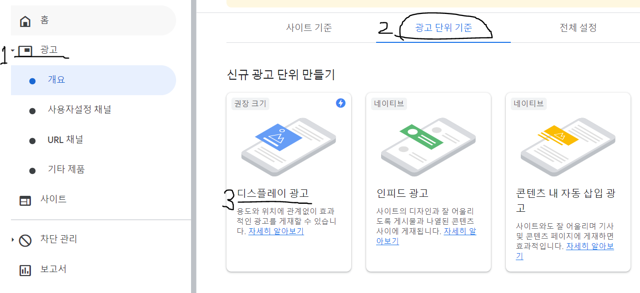 3. 신규 광고 단위 만들기 세 개의 텝에서 디스플레이 광고를 클릭한다. 다른 것 도 있지만 지금은 염두하지 않는다.