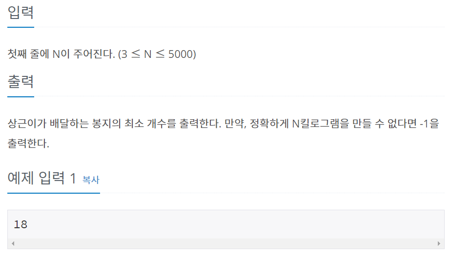 설탕은 3kg봉지 5kg봉지 가 있는데 n(입력)kg를 배달해야 하고 가장 적은 봉지를 들고가야 하는 알고리즘이다.